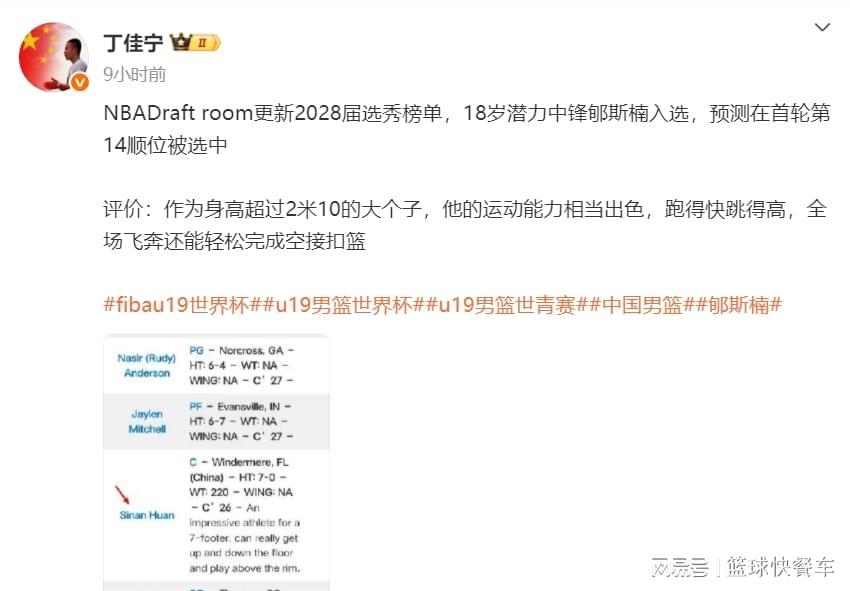 杨瀚森之后,中国男篮下一个登陆NBA的球员究竟是谁?近日,美国NBA draft room选秀网站更新最新一期,在2028年NBA模拟选秀上,中国男篮天才中锋郇斯楠成功上榜,在这份榜单上,18岁的郇斯楠出现在了首轮第14顺位上。并且,在该网站还给予郇斯楠高度评价。看样子,在杨瀚森成功冲击NBA以后,中国男篮年轻球员的身价也水涨船高,成为了NBA的香饽饽。